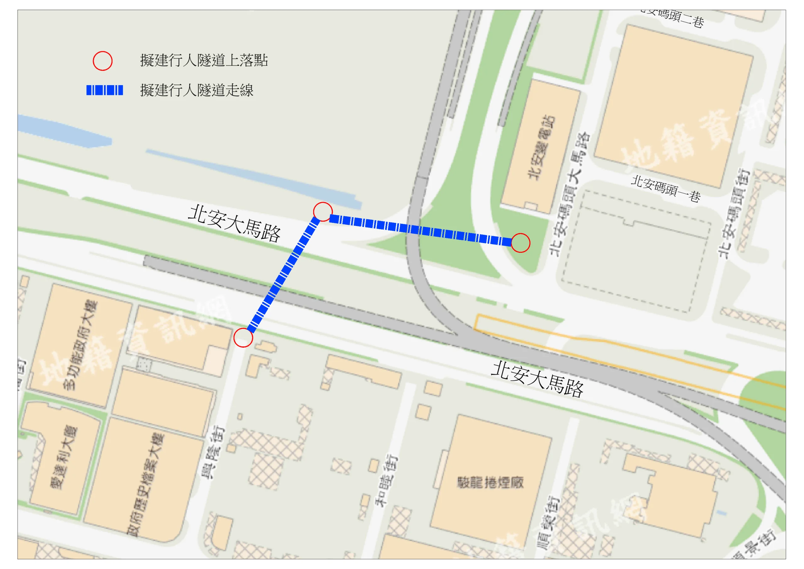 該路段是鄰近友誼大橋及澳門大橋出入口的主要幹道,現時附近僅設有由水馬和紅綠燈搭成的行人設施。公共建設局指隨着氹仔北安大馬路附近區域多個政府辦公大樓相繼投入使用,增加了人員及市民出行需要。為完善區內行人過路設施不足情況,政府將建造一條具備無障礙設施的地下行人隧道,以提供安全的人車分隔步行環境供公眾使用。