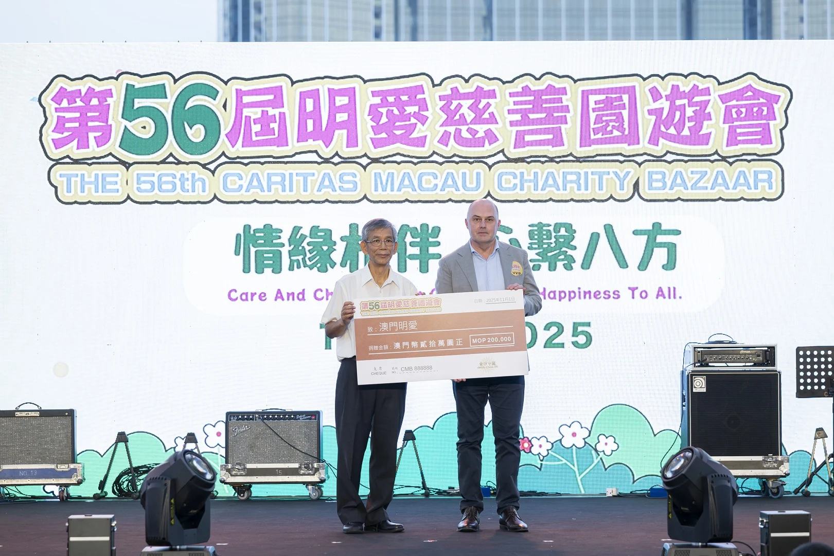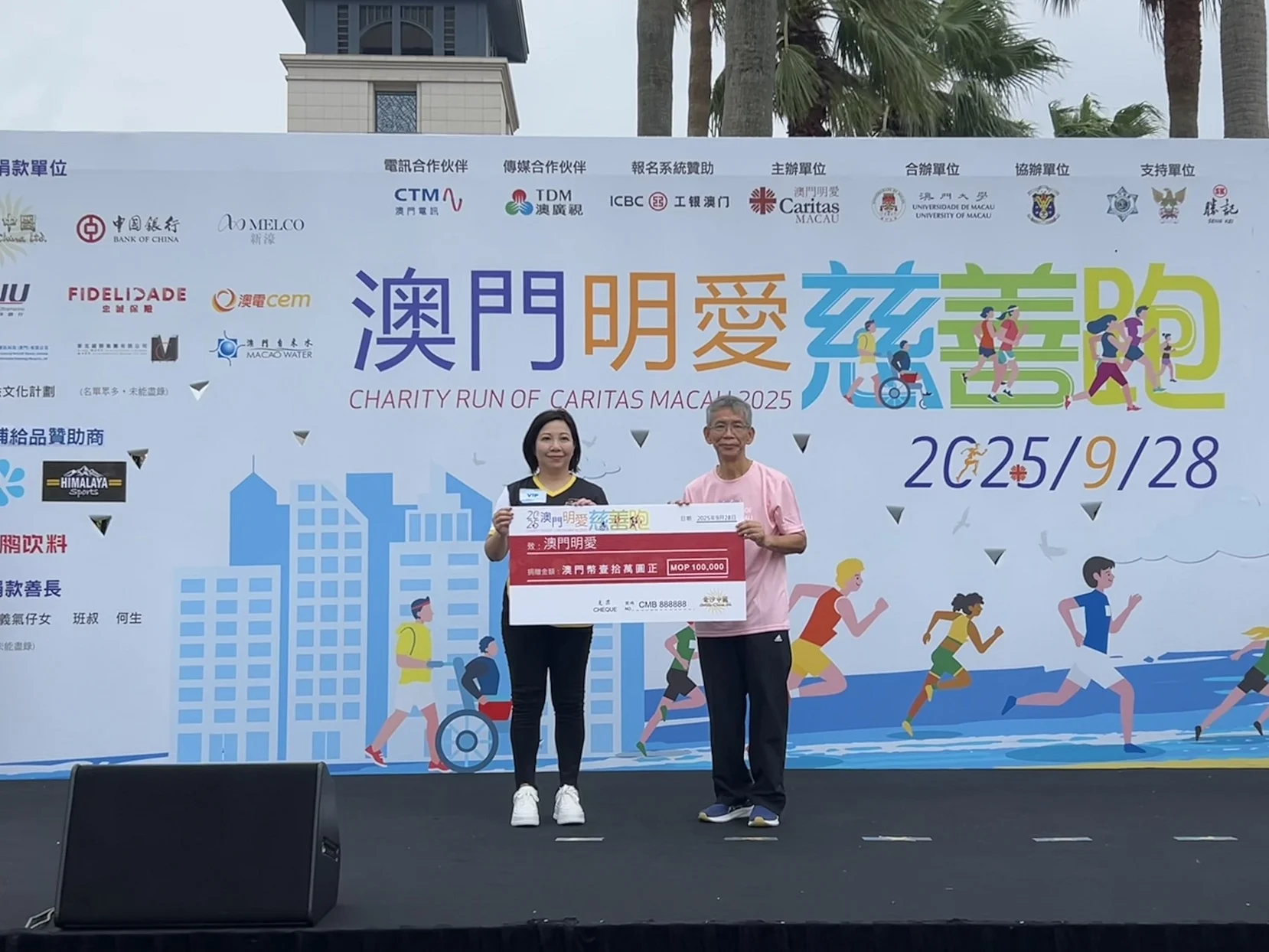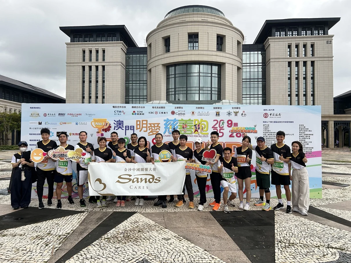 金沙中國社會事務總監林妤庭於9月28日在澳門大學舉行的支票捐贈儀式上,將澳門幣10萬元的善款交予澳門明愛總幹事潘志明,以支持「2025澳門明愛慈善跑」。金沙中國關懷大使亦出席了支票捐贈儀式,並一同參與5公里健康跑,藉此推廣健康生活、促進社區共融及家庭和諧。