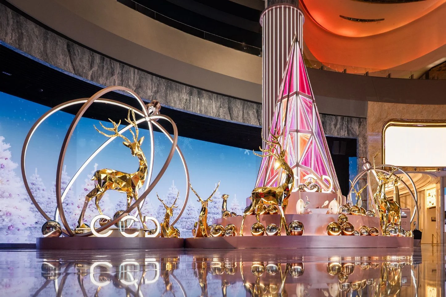 新濠天地昨(2日)下月4日舉行「濠夢聖誕頌」慶祝活動,在南門戶外花園展示一個13米的金色馴鹿冬日裝置。金光大道入口處的戶外花園還有一棵10米的聖誕樹,由數座3米高的馴鹿裝置陪襯,東南門亦有創新燈飾。渡假村主入口設有一個15米寛的巨型聖誕裝置,一座9米高的金色聖誕樹與金色馴鹿相伴而立。