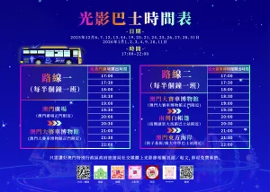 探索「2025澳門國際光影節」 本屆光影節於南灣區、新口岸區及北區設有28組燈光裝置,結合3D光雕表演、夜市及美食,進一步促進文旅結合與社區經濟。歡迎瀏覽官方平台,一覽光影裝置分佈、活動日程及更多詳情。旅遊局提供兩條免費光影巴士路線,從澳門廣場(正門附近)出發,由下午5時至晚上10時,約每30分鐘一班。