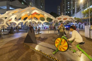 由Pneuhaus工作室帶來的藝術燈光裝置Canopy。參與者可通過騎行腳踏車發電機爲燈光裝置供電,隨著能量的注入,頂部燈光氣膜將展開綻放,像一片葡式花磚組成的森林。(圖片:澳門旅遊局)