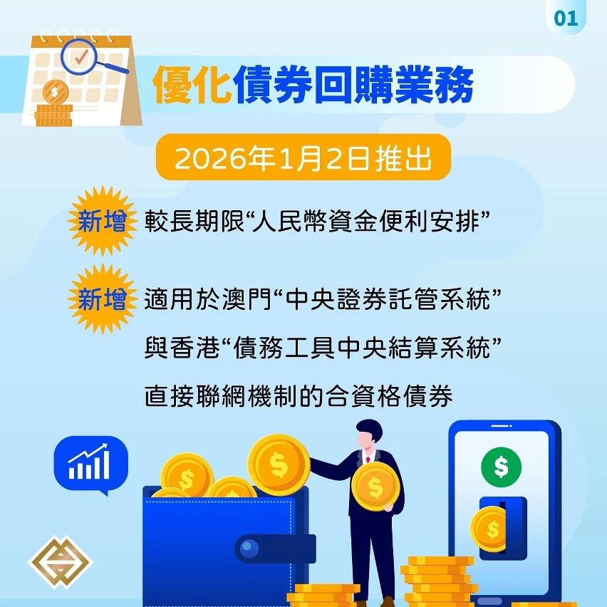 金管局表示為支持本地貨幣市場及債券市場發展,債券回購業務於即日起新增較長期限的「人民幣資金便利安排」。而本地銀行可利用澳門「中央證券託管系統(CSD)」與香港「債務工具中央結算系統(CMU)」直接聯網機制下的合資格債券進行回購業務,進一步發揮兩地聯動和協同發展效應。