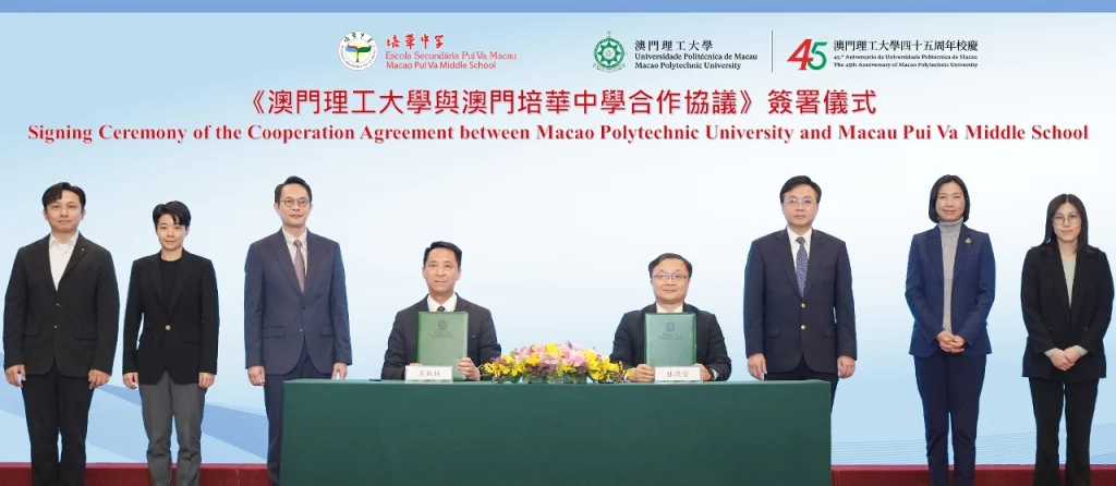 在澳理大校長嚴肇基、副校長李雁蓮、校務研究及協調部代部長李荔褀,以及培華中學校董會副主席李俊鳴、校監許樂敏、校監劉智龍的共同見證下,澳理大應用科學學院院長林燦堂與培華中學校長李秋林代表雙方簽署《澳門理工大學與澳門培華中學合作協議》,標誌著兩校在人工智能教育領域的合作正式啟動。