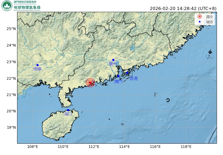氣象局指,震源深度約為10公里,震中約位於北緯21.75度,東經111.77度,距離澳門西南偏西約191公里。
