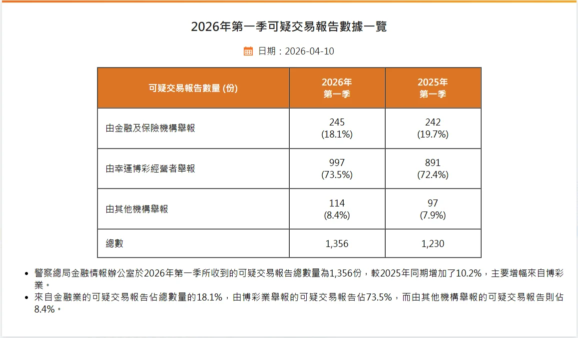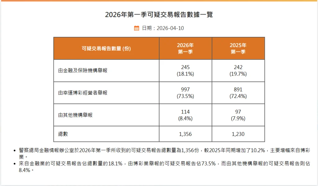 金融情報辦公室的數據顯示,首季由幸運博彩經營者舉報的可疑交易達997份,佔總數73.5%,較2025年同期的891份增加106份;由金融及保險機構舉報的有245份,佔比18.1%,去年同期為242份(19.7%);由其他機構舉報的為114份,佔8.4%,去年同期為97份(7.9%)。