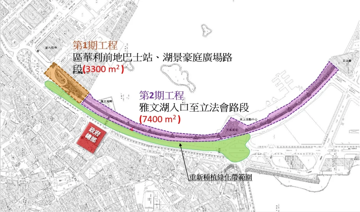 南灣湖景大馬路的行人道及周邊道路優化工程第二期公開招標,工程主要包括重整地台及重新鋪砌地台飾面,並優化沿湖圍基及綠化帶。工程面積約7,400平方米,由雅文湖畔入口延伸至立法會路段。
