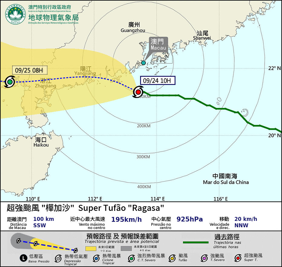超強颱風「樺加沙」週一(22日)晚通過呂宋海峽進入南海,現正集結於澳門東南偏東約510公里,以時速約20公里向西北偏西方向移動。氣象局週二(23日)下午五時發出八號風球,並於下午一時發出橙色風暴潮警告。